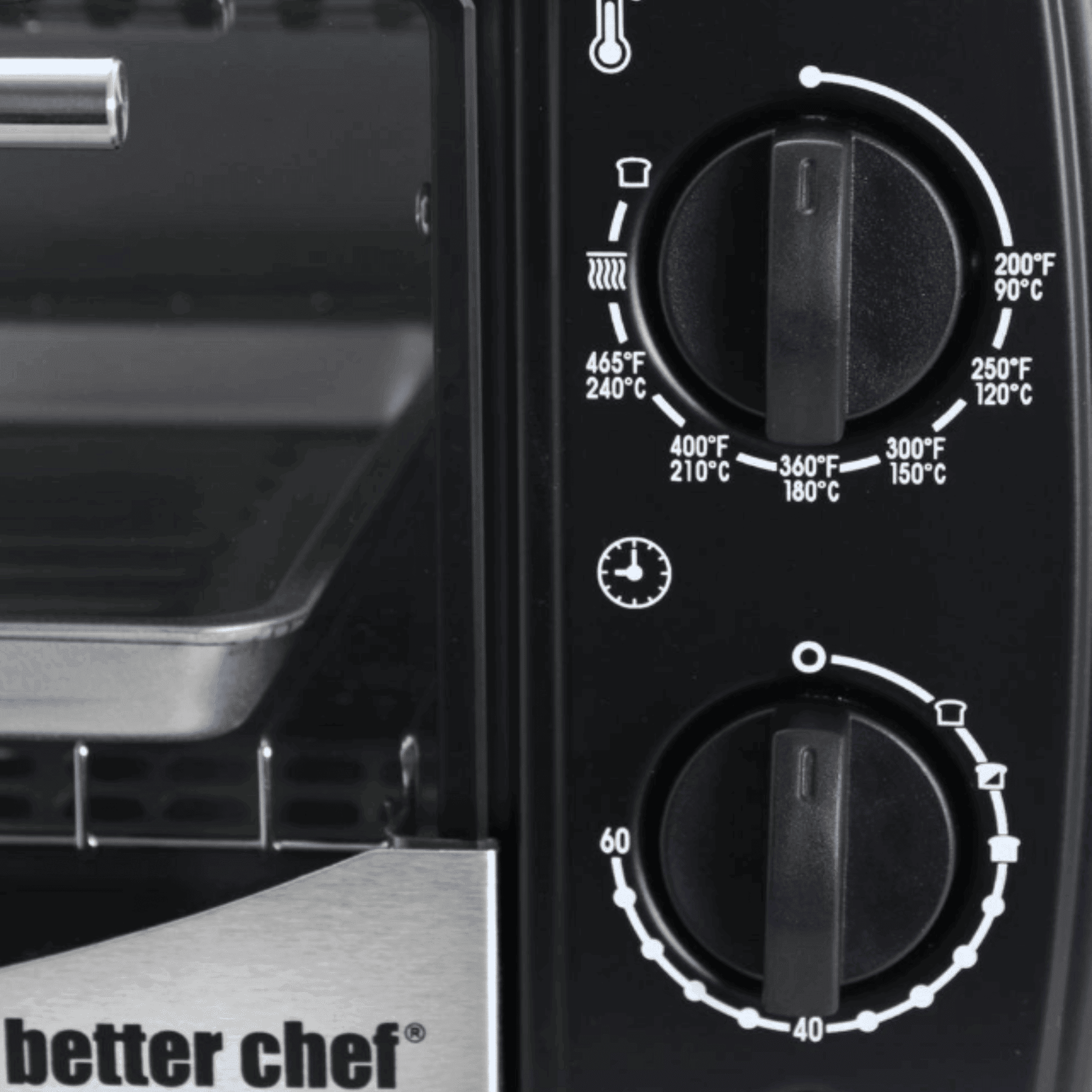 Enhance your day with the Better Chef Toaster Oven, offering versatile controls to cook or warm up various foods like toast, pizza, pop-tarts, bagels, and more. With its ability to bake, broil, toast, and roast, it accommodates a wide range of meals. The easy slide-out grill rack comfortably accommodates four slices of bread or an eight-inch pizza. Equipped with a 60-minute timer, you'll always know when it's time to enjoy your meal.