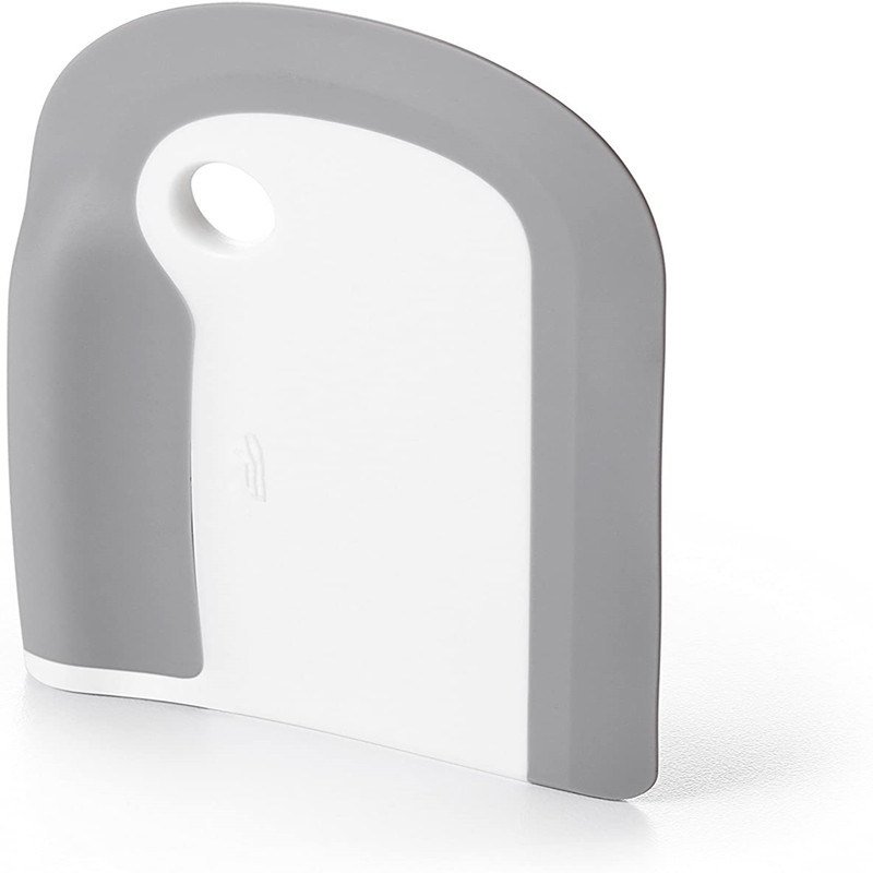 Flexible scraper edge effectively removes food residue from plates and bowls