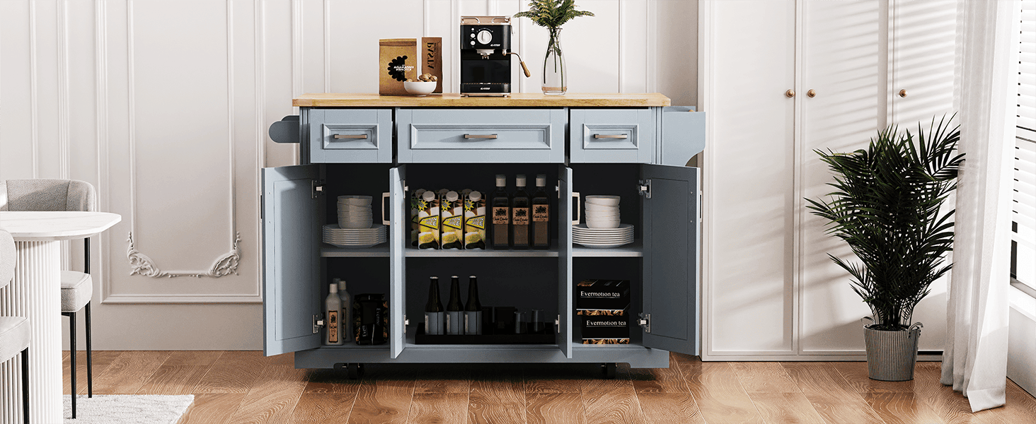 [Large Storage Space] The storage kitchen island offers a variety of storage options to maintain a clutter-free space: the 47'' wide rubber wood top provides easy access for frequently used items and ample workspace. The three drawers offer additional storage for smaller items such as napkins, coasters, or wine accessories. The four doors open to reveal adjustable shelves, allowing for customizable interior storage based on individual needs.