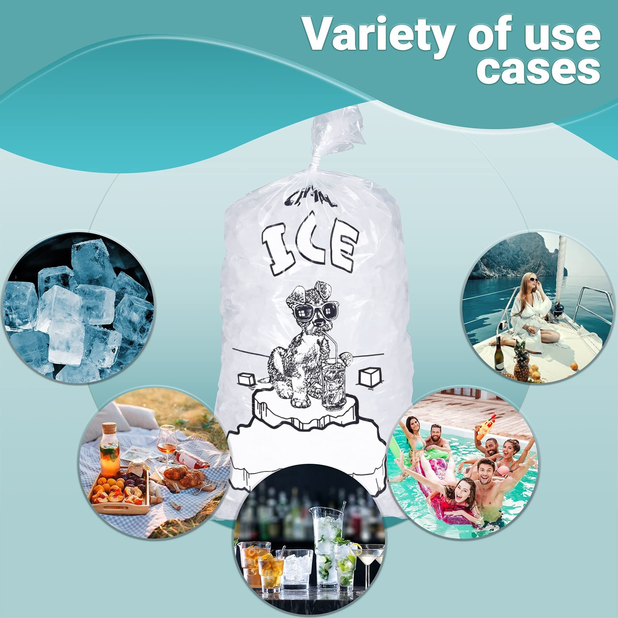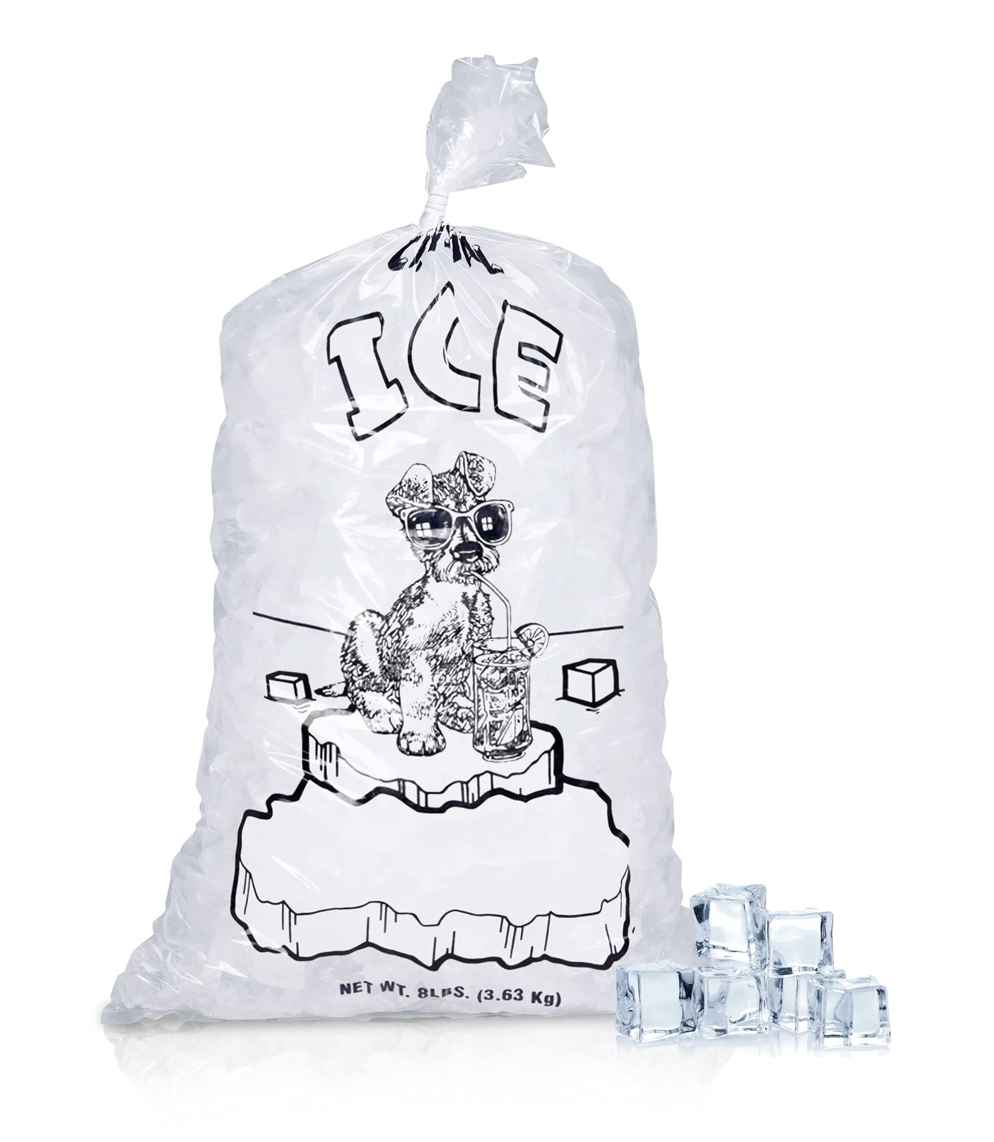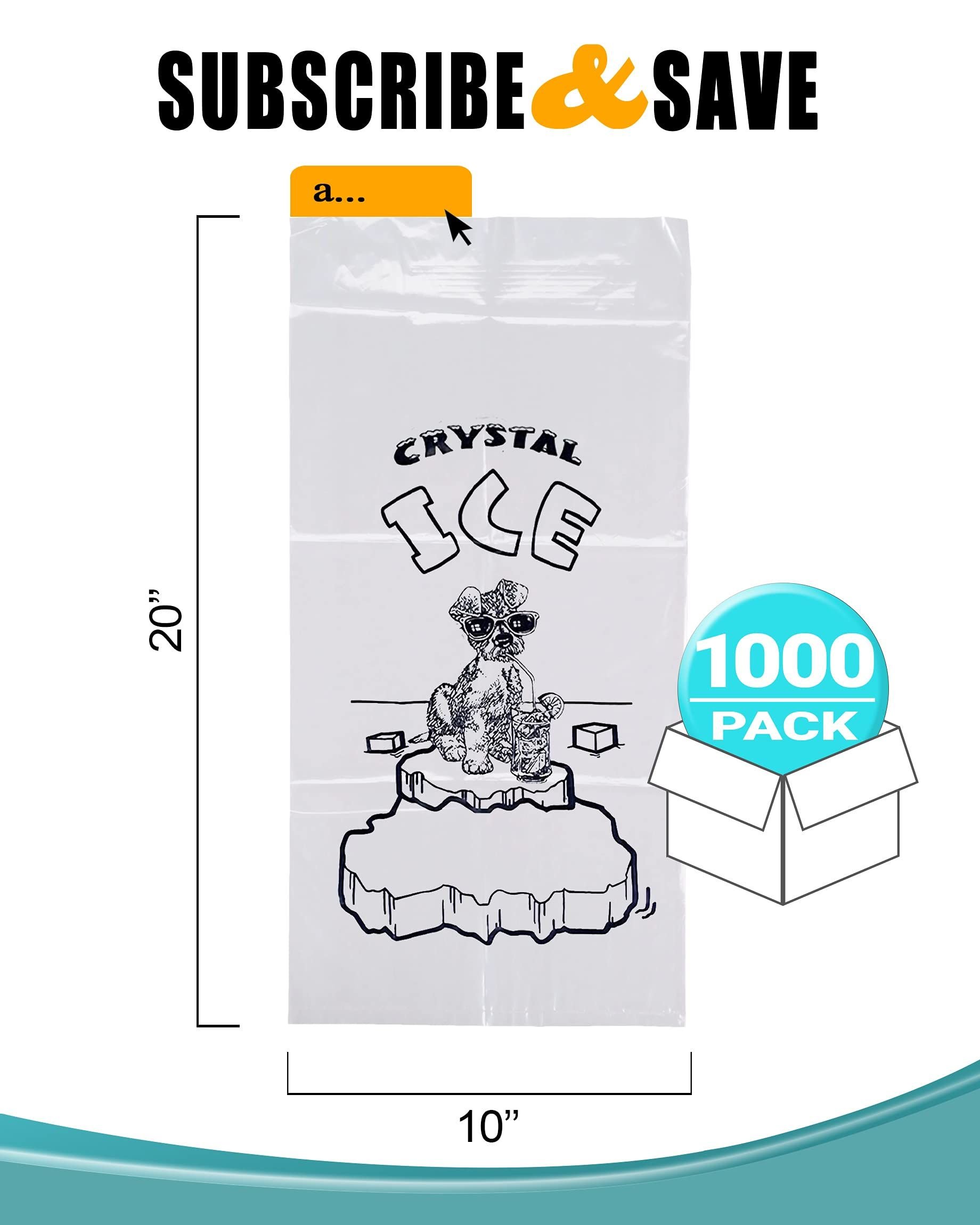 1.Pack of 1000 plastic ice bags 10" x 20", 8 lb. "Crystal Ice" plastic ice bags are pre-printed and the large opening makes packaging ice cubes easy. These 8 pound ice bags with twist ties are 1.5 mil thick, measure 10" wide and 20" long. Each ice bag is pre-printed with an image of a dog standing on ice with the text "Crystal Ice".