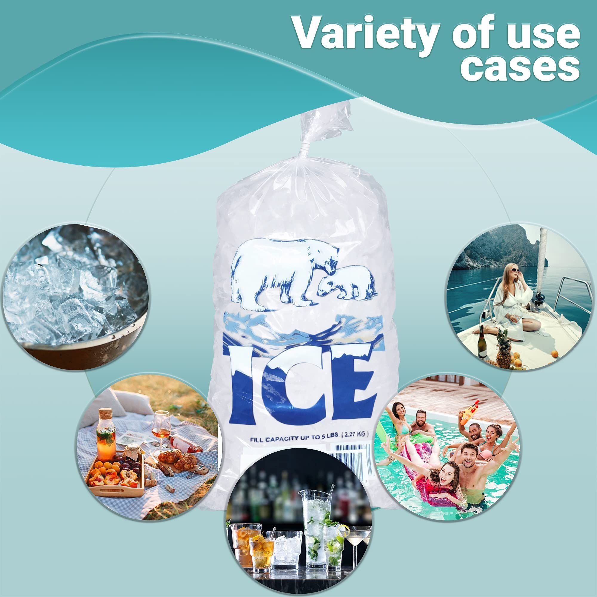 1.Pack of 1000 plastic ice bags 5 lb 9" x 18". "Polar bear and cub" design plastic ice bags have large opening that makes packaging ice cubes easy. These 5 pound ice bags with twist ties are 1. 5 mil thick are pre-printed with an image of a polar bear standing on ice with the text.