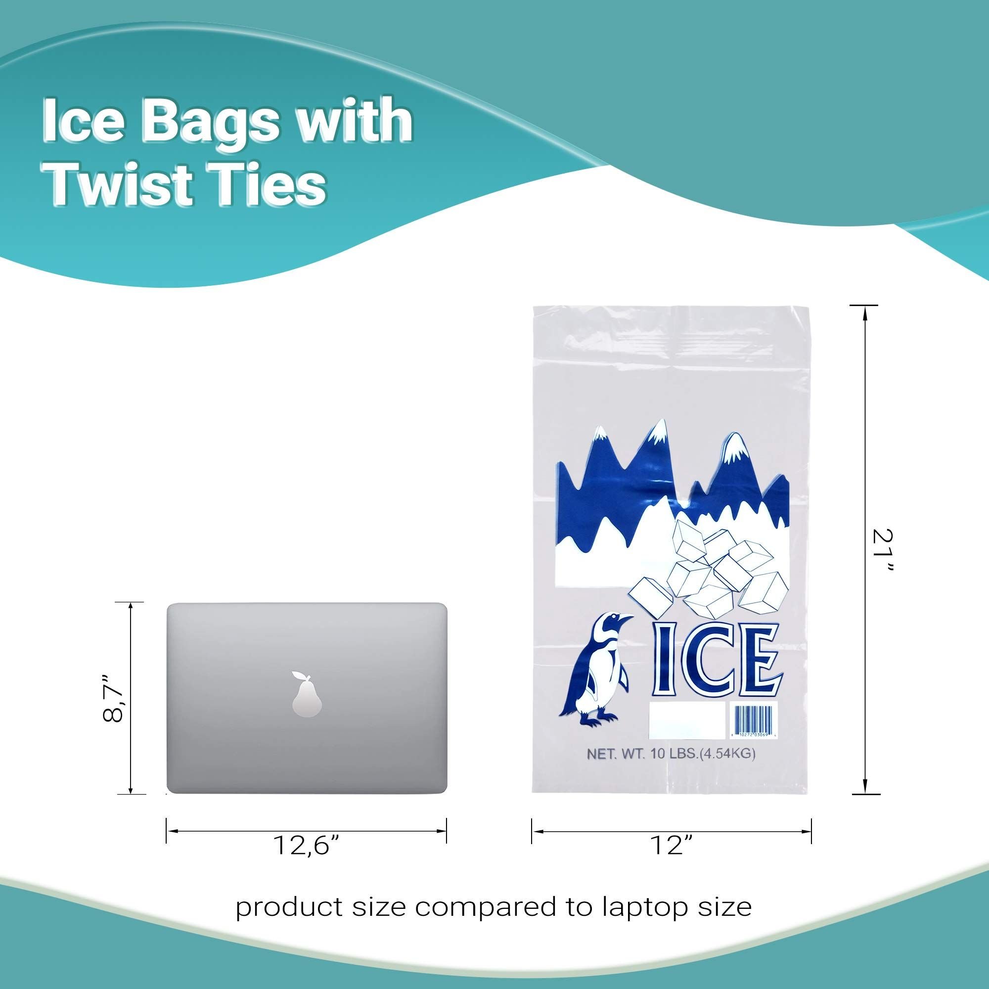1.Pack of 1000 PLASTIC ICE BAGS 12" x 21". 10 lb. 'Cool Penguin' design plastic ice bags have 1.7 mil thick and large opening that makes packaging ice cubes easy. These 10 pound ice bags with twist ties are pre-printed with an image of a penguin standing on ice with the text.