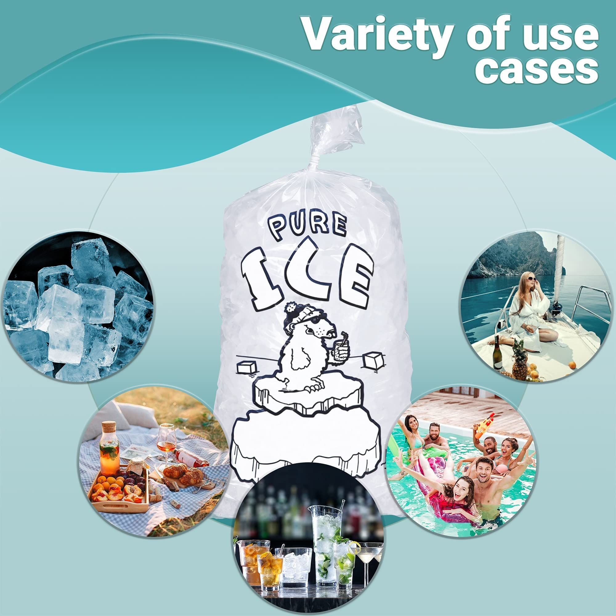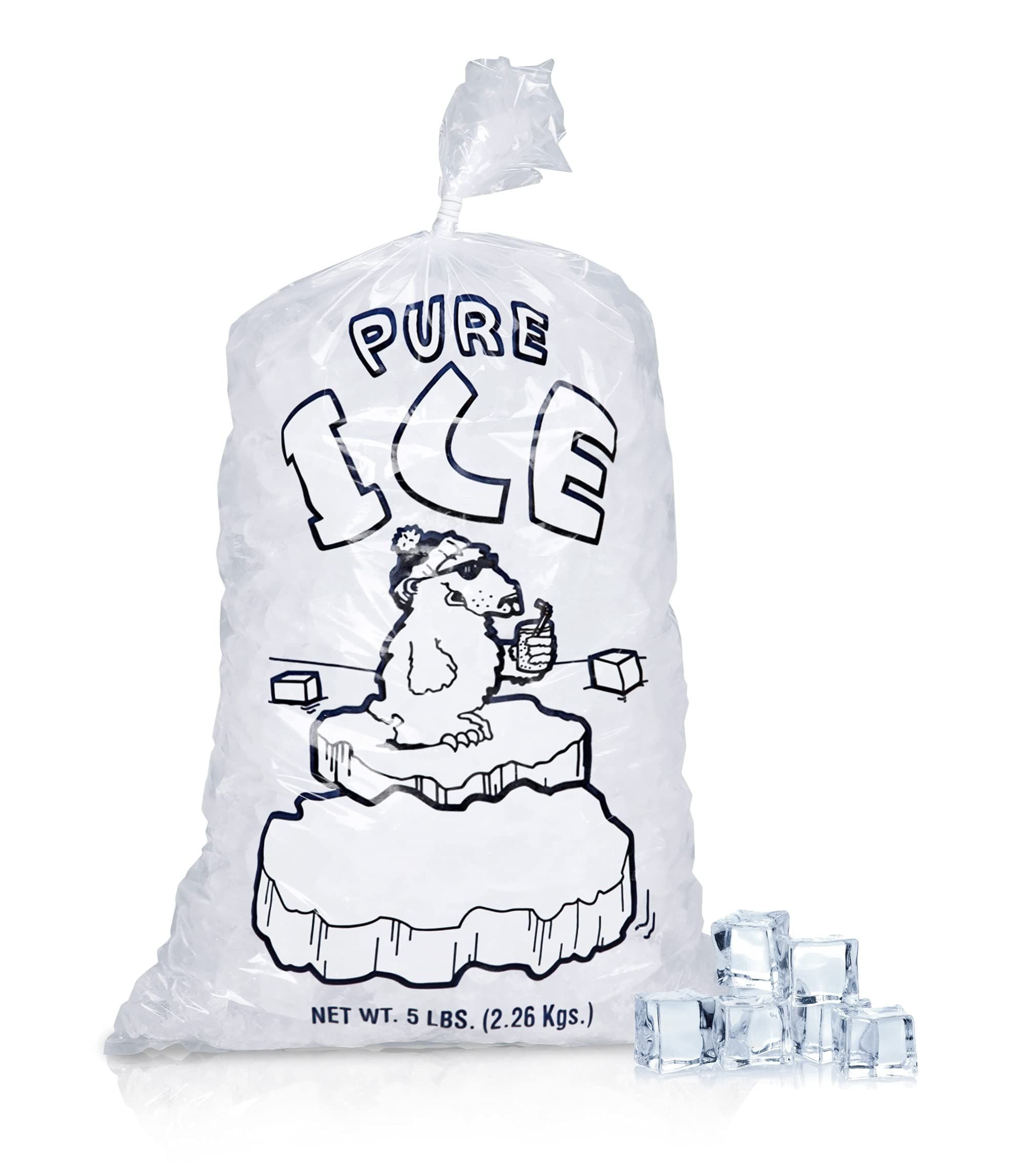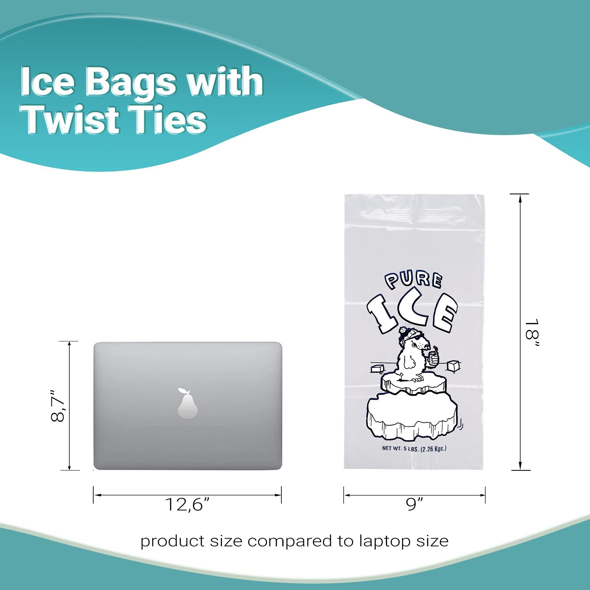 1.Pack of 1000 Plastic Ice Bags 9' x 18', 5 lb. "Pure Ice" plastic ice bags are pre-printed and the large opening makes packaging ice cubes easy. These 5 pound ice bags with twist ties are 1.5 mil thick, measure 9" wide and 18" long. Each ice bag is pre-printed with an image of a polar bear standing on ice with the text "Pure Ice".