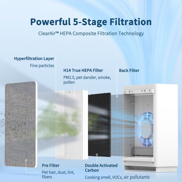 [5-Stage Filtration System] H14 HEPA air purifiers are equipped with a 5-Stage filter. The activated carbon filter adopts the most advanced carbon sticking process, 1.5 mm cylindrical activated carbon is fixed on the honeycomb grid in an organized structure, which effectively improves the adsorption capacity and reduce noise. The home air purifier can effectively filter 99.99% of dust, pollen, smoke, and pet dander, etc. as small as 0.1-0.3 microns.
