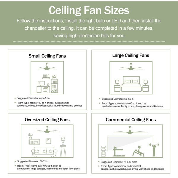• [Manipulated by the Remote Control]The ceiling fan is equipped with a remote control for your convenience. There are 6 speeds that can be adjusted to meet your different needs and maintain the ideal comfort level. And it has timing function, so you can set 2 different times (2 hours / 4 hours ) as needed.
