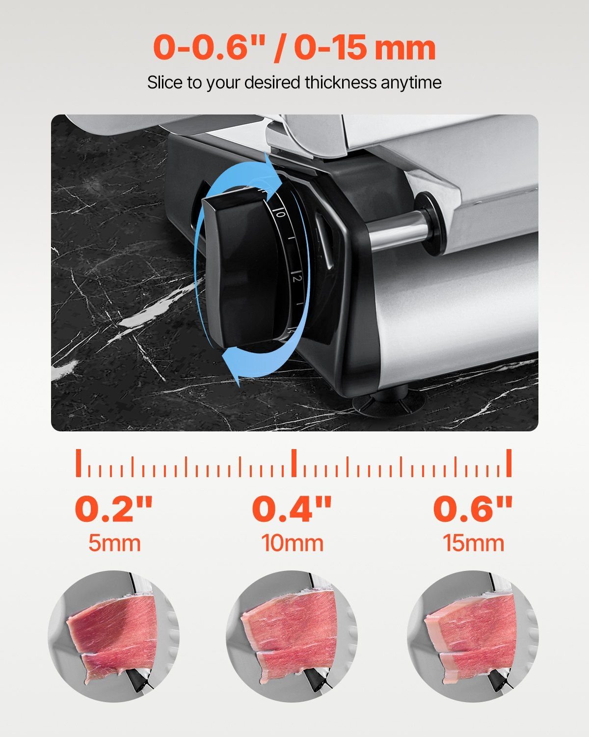 3.Adjustable Thickness: The deli meat slicer features a thickness adjustment knob with a range from 0-0.6 in (0-15 mm). You can easily customize the thickness to meet your preparation needs. Ideal for making hamburgers, sandwiches, cold cuts, fruit platters, and more.