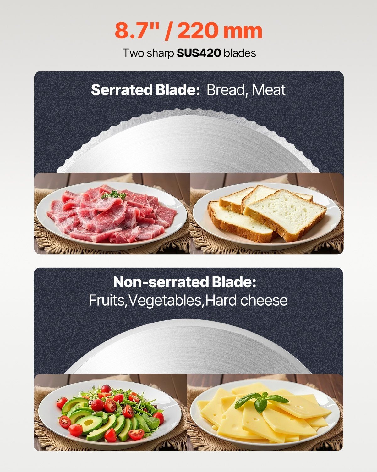 1.8.7" Stainless Steel Blades: Our meat slicer is equipped with two upgraded 8.7" wide SUS420 stainless steel blades, effortlessly handling various food textures such as frozen meat, cheese, ham, and bread.