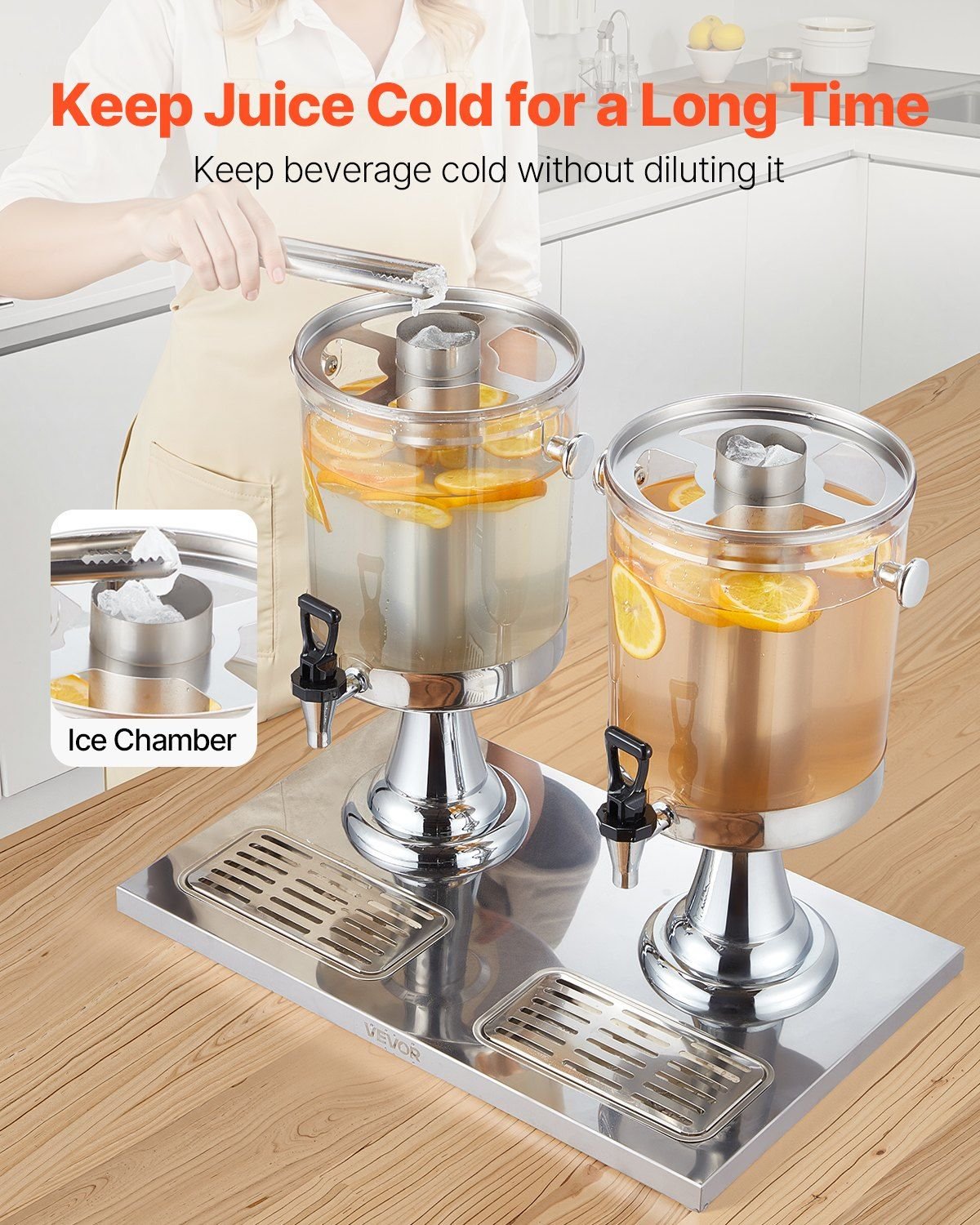 The transparent cylinder allows you to easily monitor the remaining beverage level. The ice chamber keeps drinks cold without diluting them, and the drip tray catches any spilled juice.