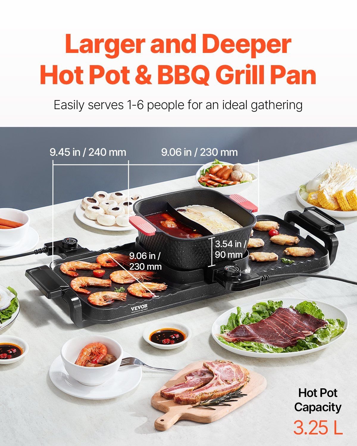 2.Large Capacity: Featuring a detachable 9.06 x 9.06 x 3.54 in (230 x 230 x 90 mm) hot pot and two 9.45 x 8.66 in ( 240 x 220 mm) grill pans, our 3.25 L hot pot and grill easily serve 1-6 people for a fun and filling gathering