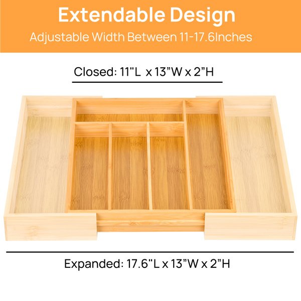 Experience the perfect blend of versatility and organization with our Expandable Bamboo Kitchen Drawer Organizer. Made from premium, moisture-resistant bamboo, it expands from 11 to 17.6 inches to fit various drawer sizes. With 5 to 7 compartments, it neatly stores utensils, silverware, jewelry, and kitchen essentials, keeping everything accessible and clutter-free. Its durable, eco-friendly design and smooth, polished finish add a touch of natural elegance to your home. Upgrade your storage with this space-saving, adjustable organizer.