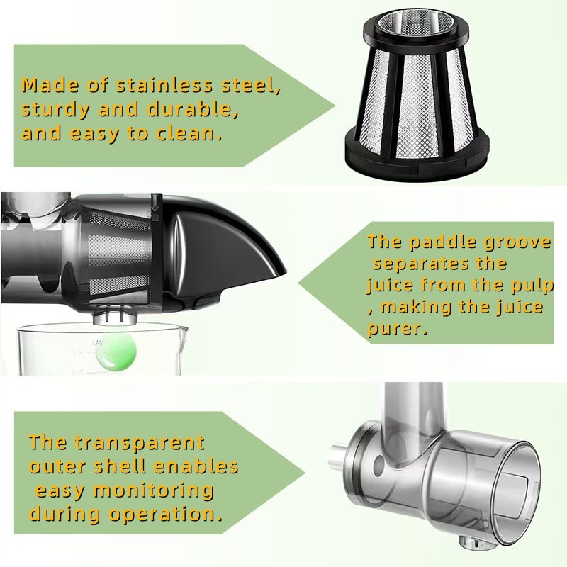 2.Easy installation: Turn off the stand mixer and unplug it before assembly. The inside of the juicer is made of stainless steel, durable and easy to clean; It has a transparent housing for easy monitoring during operation.
