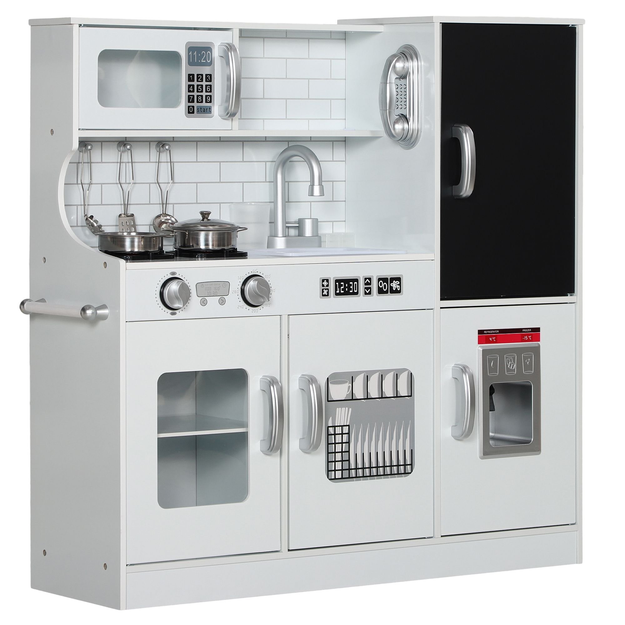Unleash culinary creativity with the Qaba play kitchen. This kid's kitchen playset sparks the imagination by featuring a chalkboard to jot down today's menu, a realistic ice maker, and a phone. It includes a stove and microwave, encouraging little chefs to explore their cooking skills. Tailored for ages 3-8, this toddler kitchen playset is a delightful playroom addition.