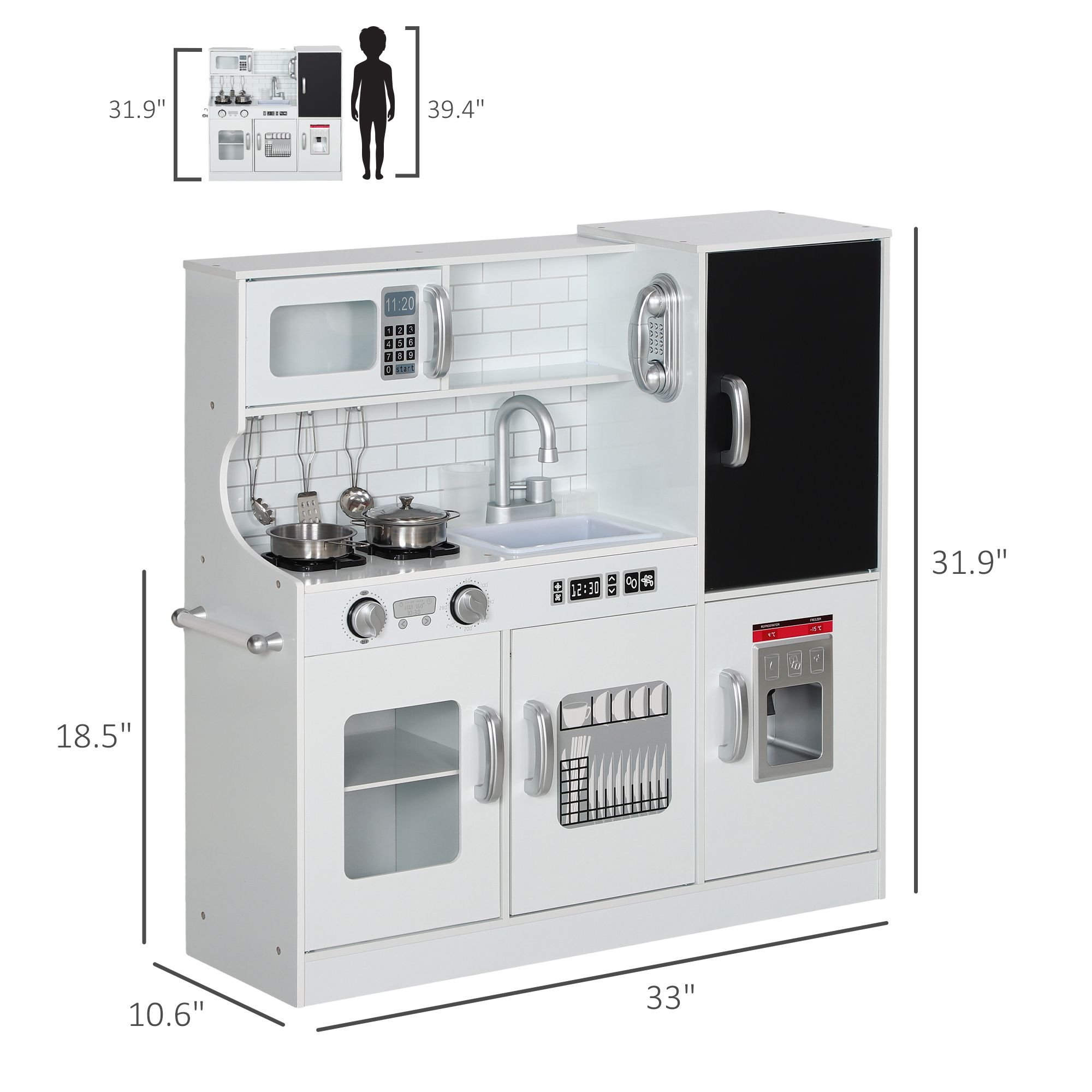 5.- Kids Kitchen Set Info: Overall Dimensions: 33" L x 10.6" W x 31.9" H. Table height: 18.5" H. Assembly required.
