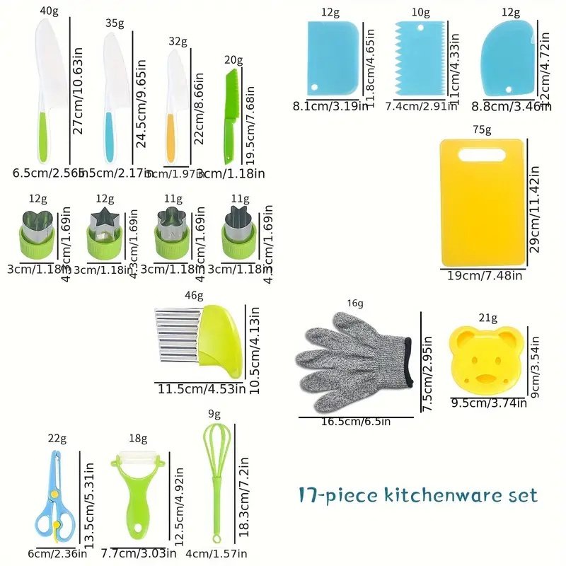 Real kitchenware experience: A 12 piece set of kitchen tools designed specifically for children aged 4-8, including safety knives, mixing bowls, baking molds, etc. It is fully functional but mini in size, allowing children to experience the joy of real cooking.
