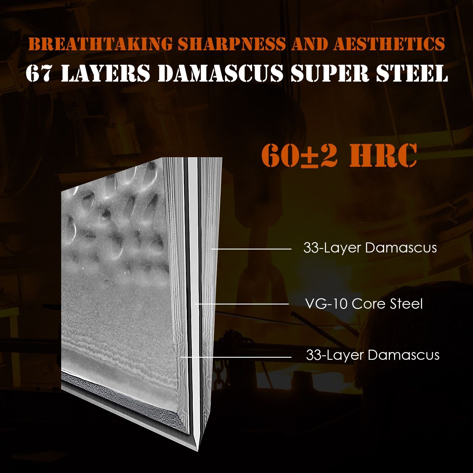 • ✅SHARP SANTOKU KNIFE - Japanese santoku knife is made with Japanese VG-10 steel core, 67 layers real damascus steel for excellent edge retention. HRC 60±2, excellent rust resistance and wear resistance. The Santoku knife, also known as the Japanese chef's knife, has superior performance and is characterized by slicing, dicing, and chopping.